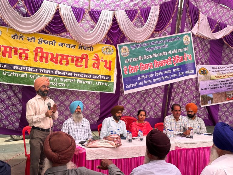 ਟ੍ਰੇਨਿੰਗ ਅਫ਼ਸਰ ਜਲੰਧਰ ਡਾ. ਪ੍ਰਵੀਨ ਕੁਮਾਰੀ ਨੇ ਕਿਸਾਨਾਂ ਨੂੰ ਮਿੱਟੀ ਪਰਖ ਕਰਨ ਲਈ ਪ੍ਰੇਰਿਤ ਕੀਤਾ ਅਤੇ ਸੰਤੁਲਿਤ ਖਾਦਾਂ ਦੀ ਵਰਤੋਂ ਕਰਨ ਲਈ ਕਿਹਾ। ਜ਼ਿਲ੍ਹਾ ਟ੍ਰੇਨਿੰਗ ਅਫ਼ਸਰ ਡਾ. ਸੁਖਚੈਨ ਸਿੰਘ ਨੇ ਕਿਹਾ ਕਿ ਪ੍ਰਤੀ ਹੈਕਟੇਅਰ ਗੰਨੇ ਦੀ ਉਤਪਾਦਕਤਾ ਵਧਾਉਣ ਨਾਲ ਗੰਨੇ ਦੀ ਫ਼ਸਲ ਦੀ ਖੇਤੀ ਨੂੰ ਲਾਹੇਵੰਦ ਬਣਾਇਆ ਜਾ ਸਕਦਾ ਹੈ। ਉਨ੍ਹਾਂ ਕਿਹਾ ਕਿ ਗੰਨੇ ਦੀ ਪ੍ਰਤੀ ਹੈਕਟੇਅਰ ਪੈਦਾਵਰ ਵਧਾਉਣ ਦੇ ਮਕਸਦ ਲਈ ਗੰਨਾ ਕਾਸ਼ਤਕਾਰਾਂ ਨੂੰ ਚੌੜੀ ਵਿੱਥ ਵਿਧੀ ਅਪਣਾਉਣ ਲਈ ਪ੍ਰੇਰਿਤ ਕੀਤਾ ਜਾ ਰਿਹਾ ਹੈ। ਡਾ. ਮਨਿੰਦਰ ਸਿੰਘ ਨੇ ਦੱਸਿਆ ਕਿ ਗੰਨੇ ਦੀ ਫ਼ਸਲ ਵਿਚ ਝੋਨੇ ਦੀ ਪਰਾਲੀ ਖਿਲਾਰਨ ਨਾਲ ਜਿੱਥੇ ਵਾਤਾਵਰਨ ਨੂੰ ਪ੍ਰਦੂਸ਼ਿਤ ਹੋਣ ਤੋਂ ਬਚਾਇਆ ਜਾ ਸਕਦਾ ਹੈ ਉਥੇ ਸਰਦੀ ਅਤੇ ਗਰਮੀ ਤੋਂ ਫ਼ਸਲ ਦਾ ਬਚਾਅ ਹੋਣ ਕਾਰਨ ਪ੍ਰਤੀ ਹੈਕਟੇਅਰ ਪੈਦਾਵਾਰ ਵਿੱਚ ਵੀ ਵਾਧਾ ਹੋ ਸਕੇਗਾ। ਡਾ. ਗੁਰਪ੍ਰੀਤ ਸਿੰਘ ਕਿਸਾਨਾਂ ਨੂੰ ਸੁਚੱਜੀ ਮੰਡੀਕਰਣ ਅਤੇ ਖੇਤੀ ਅਧਾਰਿਤ ਸਹਾਇਕ ਧੰਦੇ ਅਪਨਾਉਣ ਲਈ ਪ੍ਰੇਰਿਤ ਕੀਤਾ।