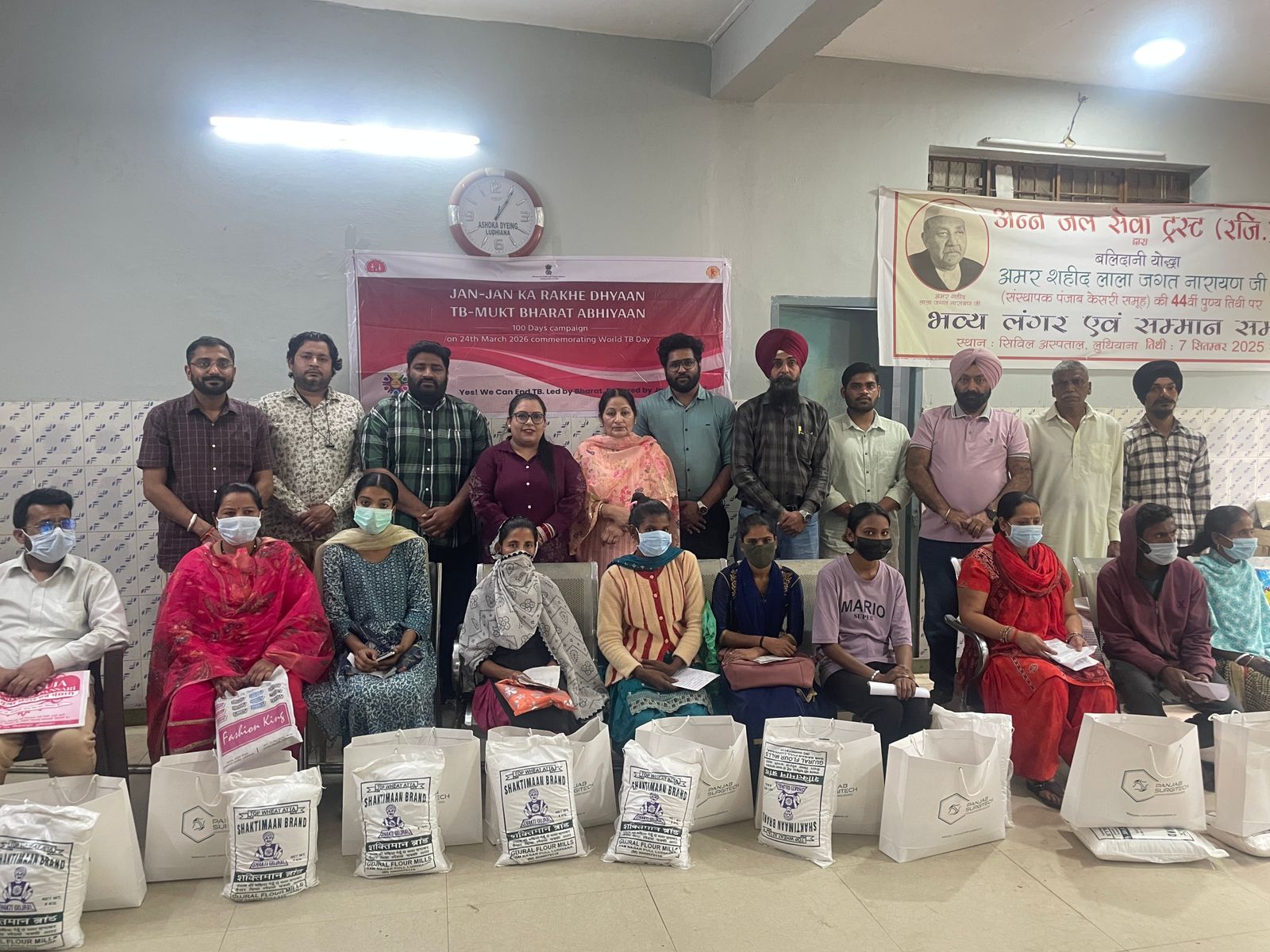 ਜ਼ਿਲ੍ਹਾ ਪ੍ਰਸ਼ਾਸਨ ਅਤੇ ਸਿਹਤ ਵਿਭਾਗ ਦੇ ਨਿਰਦੇਸ਼ਾਂ ‘ਤੇ ‘ਅੰਨ ਜਲ ਸੇਵਾ ਟਰੱਸਟ’ ਜੋ ਲਗਾਤਾਰ ਸ਼ਲਾਘਾਯੋਗ ਸਮਾਜ ਸੇਵਾ ਗਤੀਵਿਧੀਆਂ ਵਿੱਚ ਰੁੱਝਿਆ ਹੋਇਆ ਹੈ, ਨੇ ਪ੍ਰਧਾਨ ਮੰਤਰੀ ਟੀ.ਬੀ ਮੁਕਤ ਭਾਰਤ ਅਭਿਆਨ ਅਤੇ ਨਿਕਸ਼ੇ ਮਿੱਤਰ ਯੋਜਨਾ ਤਹਿਤ ਸਿਵਲ ਹਸਪਤਾਲ, ਲੁਧਿਆਣਾ ਵਿਖੇ ਟੀ.ਬੀ ਮਰੀਜ਼ਾਂ ਲਈ ਰਾਸ਼ਨ ਵੰਡ ਪ੍ਰੋਗਰਾਮ ਦਾ ਆਯੋਜਨ ਕੀਤਾ।