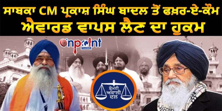 Akal Takht ’ਤੇ ਅੱਜ ਸਿੰਘ ਸਾਹਿਬਾਨਾਂ ਵੱਲੋਂ ਸੁਣਾਏ ਗਏ ਫ਼ੈਸਲਿਆਂ ਦੀ ਲੜੀ ਵਿੱਚ ਇੱਕ ਅਹਿਮ ਐਲਾਨ ਇਹ ਰਿਹਾ ਕਿ Punjab ਦੇ ਸਾਬਕਾ ਮੁੱਖ ਮੰਤਰੀ, Akali Dal ਦੇ ਸਾਬਕਾ ਸਰਪ੍ਰਸਤ ਅਤੇ ਮਰਹੂਮ ਅਕਾਲੀ ਨੇਤਾ Parkash Singh Badal ਤੋਂ ਫਖ਼ਰ-ਏ-ਕੌਮ ਐਵਾਰਡ ਵਾਪਸ ਲੈਣ ਬਾਰੇ ਐਲਾਨ ਕਰ ਦਿੱਤਾ ਗਿਆ।