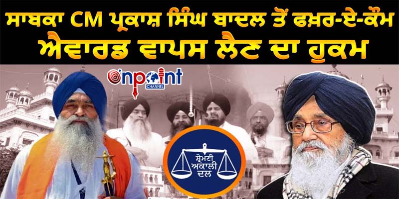 ਸ੍ਰੀ ਅਕਾਲ ਤਖਤ ਸਾਹਿਬ ਦੇ ਜਥੇਦਾਰ ਗਿਆਲੀ ਰਘੁਬੀਰ ਸਿੰਘ ਤੇ ਹੋਰ ਸਿੰਘ ਸਾਹਿਬਾਨ ਨੇ ਅੱਜ ਮਰਹੂਮ ਮੁੱਖ ਮੰਤਰੀ ਪ੍ਰਕਾਸ਼ ਸਿੰਘ ਬਾਦਲ ਤੋਂ ’ਫਖ਼ਰ ਏ ਕੌਮ’ ਐਵਾਰਡ ਵਾਪਸ ਲੈਣ ਦਾ ਐਲਾਨ ਕੀਤਾ ਗਿਆ ਹੈ।