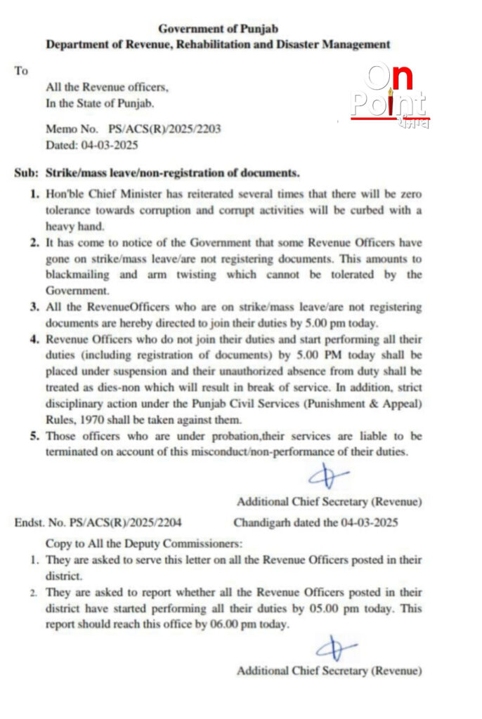 ਪੰਜਾਬ ਸਰਕਾਰ ਨੇ ਸਮੂਹਿਕ ਛੁੱਟੀ ਉਤੇ ਗਏ ਮਾਲ ਅਧਿਕਾਰੀਆਂ ਖਿਲਾਫ ਸਖਤ ਹੁਕਮ ਜਾਰੀ ਕਰ ਦਿੱਤੇ ਹਨ। ਪੰਜਾਬ ਸਰਕਾਰ ਨੇ ਮਾਲ ਅਧਿਕਾਰੀਆਂ ਨੂੰ ਸ਼ਾਮ 5 ਵਜੇ ਤੱਕ ਹੜਤਾਲ ਖਤਮ ਕਰਨ ਅਤੇ ਡਿਊਟੀ ਜੁਆਇਨ ਕਰਨ ਦੀ ਚਿਤਾਵਨੀ ਦਿੱਤੀ ਹੈ। ਜੇਕਰ ਅਜਿਹਾ ਨਾ ਕੀਤਾ ਤਾਂ ਸ਼ਾਮ 5 ਵਜੇ ਤੋਂ ਬਾਅਦ ਸਾਰਿਆਂ ਨੂੰ ਸਸਪੈਂਡ ਕੀਤਾ ਜਾ ਸਕਦਾ ਹੈ।