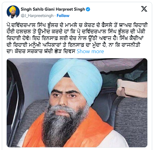 ਉਨ੍ਹਾਂ ਲਿਖਿਆ ਹੈ ਕਿ ਪ੍ਰੋ.ਦਵਿੰਦਰਪਾਲ ਸਿੰਘ ਭੁੱਲਰ ਦੇ ਮਾਮਲੇ ਚ ਕੋਰਟ ਦੇ ਫੈਸਲੇ ਤੋਂ ਬਾਅਦ ਰਿਹਾਈ ਹੋਈ ਹਲਚਲ ਤੋ ਉਮੀਦ ਕਰਦੇ ਹਾਂ ਕਿ ਪ੍ਰੋ ਦਵਿੰਦਰਪਾਲ ਸਿੰਘ ਭੁੱਲਰ ਦੀ ਪੱਕੀ ਰਿਹਾਈ ਹੋਵੇ। ਇਹ ਇਨਸਾਫ਼ ਲਈ ਦੇਰ ਨਾਲ ਉੱਠੀ ਅਵਾਜ਼ ਹੈ। ਸਿੱਖ ਕੈਦੀਆਂ ਦੀ ਰਿਹਾਈ ਮਨੁੱਖੀ ਅਧਿਕਾਰਾਂ ਤੇ ਇਨਸਾਫ਼ ਦਾ ਮੁੱਦਾ ਹੈ, ਨਾ ਕਿ ਰਾਜਨੀਤੀ ਦਾ। ਕੇਂਦਰ ਸਰਕਾਰ ਬੰਦੀ ਛੋੜ ਦਿਵਸ ਮੌਕੇ ਸਾਰੇ ਬੰਦੀ ਸਿੰਘਾਂ ਦੀ ਰਿਹਾਈ ਦਾ ਐਲਾਨ ਕਰਕੇ ਇਸ ਦਿਹਾੜੇ ਨੂੰ ਇਤਿਹਾਸਕ ਬਣਾਏ, ਇਹੀ ਸਿੱਖ ਭਾਵਨਾਵਾਂ ਦੀ ਅਸਲ ਤਰਜ਼ਮਾਨੀ ਹੈ।