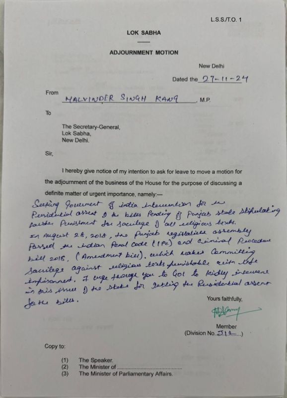 ਸੰਸਦ ਮੈਂਬਰ Malvinder Singh Kang ਨੇ ਲੋਕ ਸਭਾ ‘ਚ ਦਿੱਤਾ ਮੁਲਤਵੀ ਨੋਟਿਸ ਅਤੇ ਬੇਅਦਬੀ ਦੇ ਮੁੱਦੇ ‘ਤੇ ਚਰਚਾ ਦੀ ਮੰਗ ਕੀਤੀ।